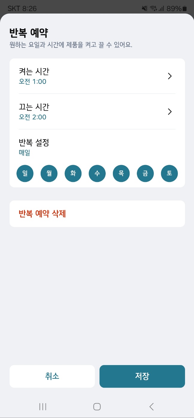 매일 예약을 킬 필요도 없이 마치 알람처럼 요일별로 반복 예약을 정해놓을 수 있습니다.