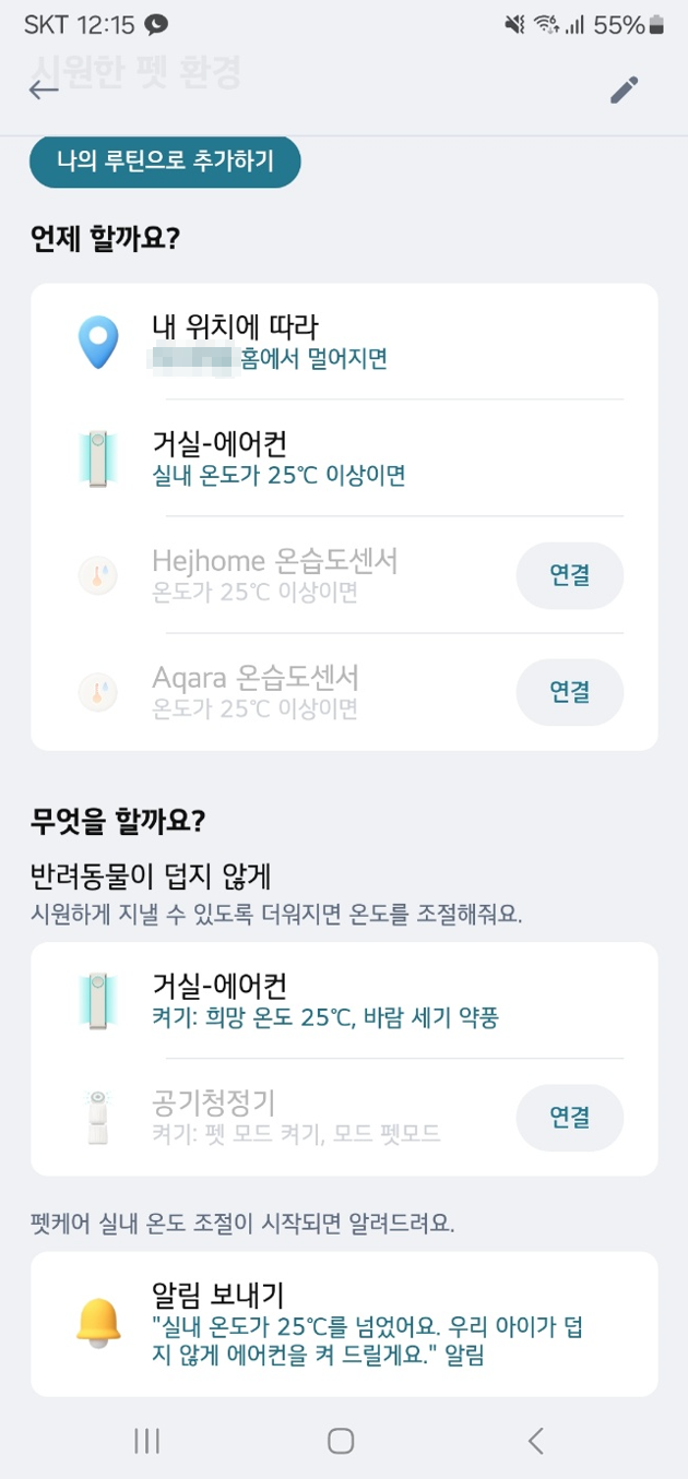 실내 온도가 일정 온도 이상으로 올라가면 설정해 놓은 온도에 맞춰서 에어컨이 켜지는 기능이 있어서 반려동물이 있는 사람들에게 유용한 기능입니다.