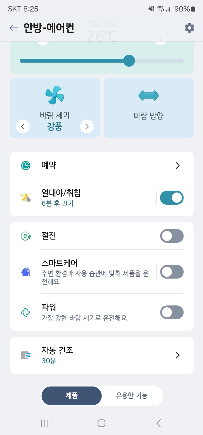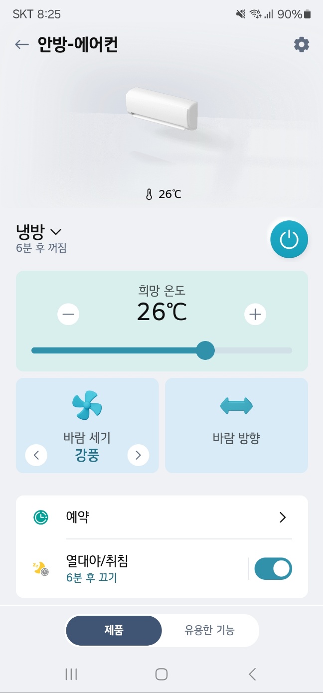 바람 세기와 방향도 조절 가능하고, 예약도 가능하기 때문에 아이들이 잠든 뒤에 제가 잠들기 전까지 어플로 온도를 확인하면서 30분 단위로 예약을 하며 에어컨을 조정 가능합니다.