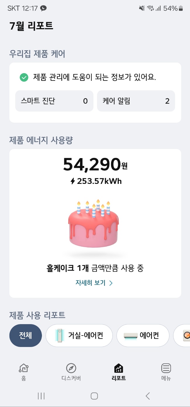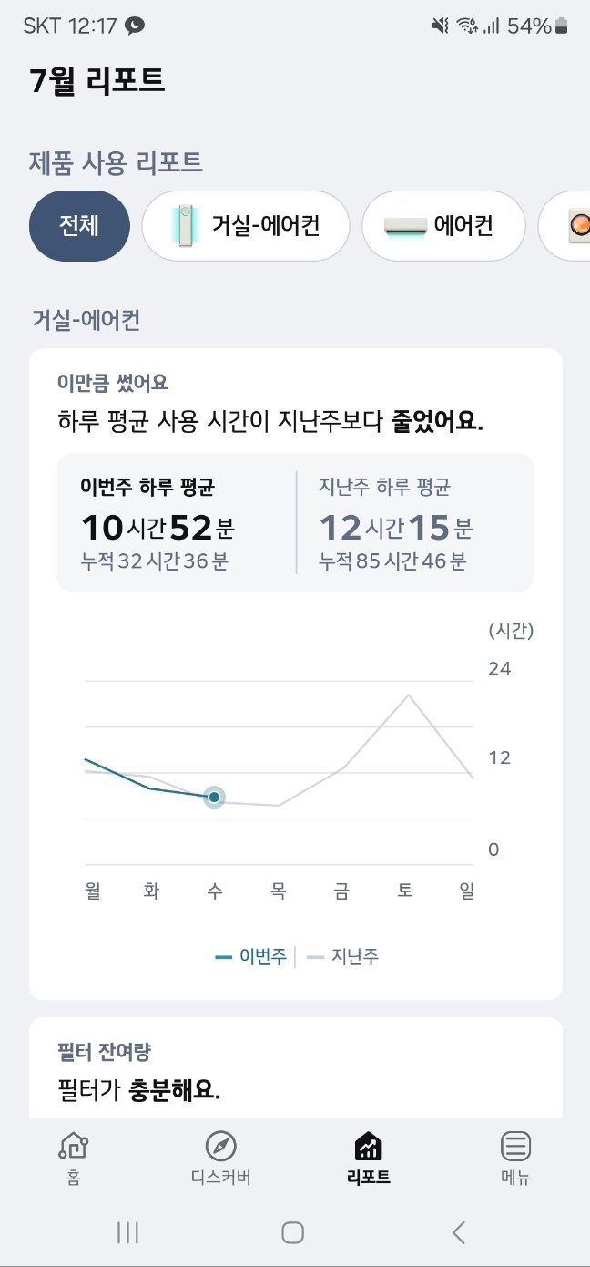 LG ThinQ 어플에서는 오늘 얼마나 에어컨을 틀었는지, 이번주 혹은 이번달에 얼마나 에어컨을 틀었는지의 데이터 통계를 확인할 수 있습니다.