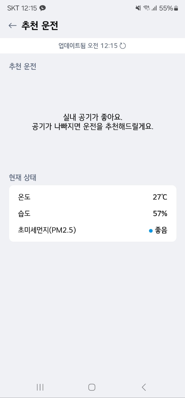현재 실내 온도를 기반으로 온습도 및 실내 공기 청정도를 파악하여 에어컨의 작동을 추천하는 기능입니다.